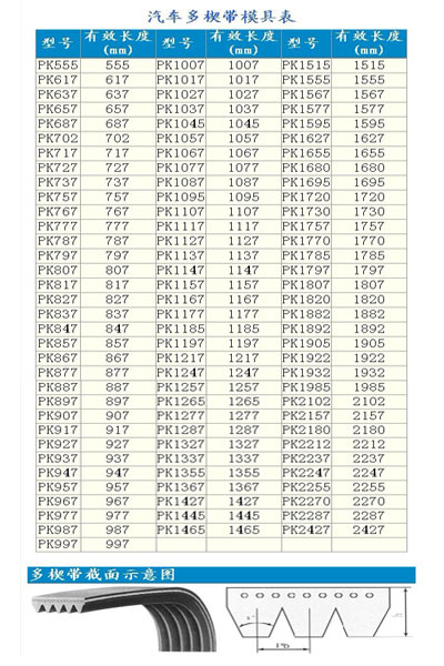 橡膠多楔帶兼 有v帶和平帶二者的優(yōu)點,既有平帶的柔軟、強韌的特點,又有v帶緊湊、高效等優(yōu)點。它的主要特點如下:1.傳動功率大,空間相同時比普通V帶的傳動功率的高30%。 2.傳動系統(tǒng)結(jié)構(gòu)緊湊,在相同的傳動功率情況下,傳遞裝置所占空間比普通V帶小25%。 3.帶體薄,富有柔軟性,適應(yīng)帶輪直徑小的傳動,也適應(yīng)高速傳動,帶速可達40m/s;振動小,發(fā)熱少,運轉(zhuǎn)平穩(wěn)。 ![]() 我公司主產(chǎn)的汽車多楔帶按照使用材料主要分為氯丁橡膠多楔帶和三元乙丙橡膠多楔帶。 |